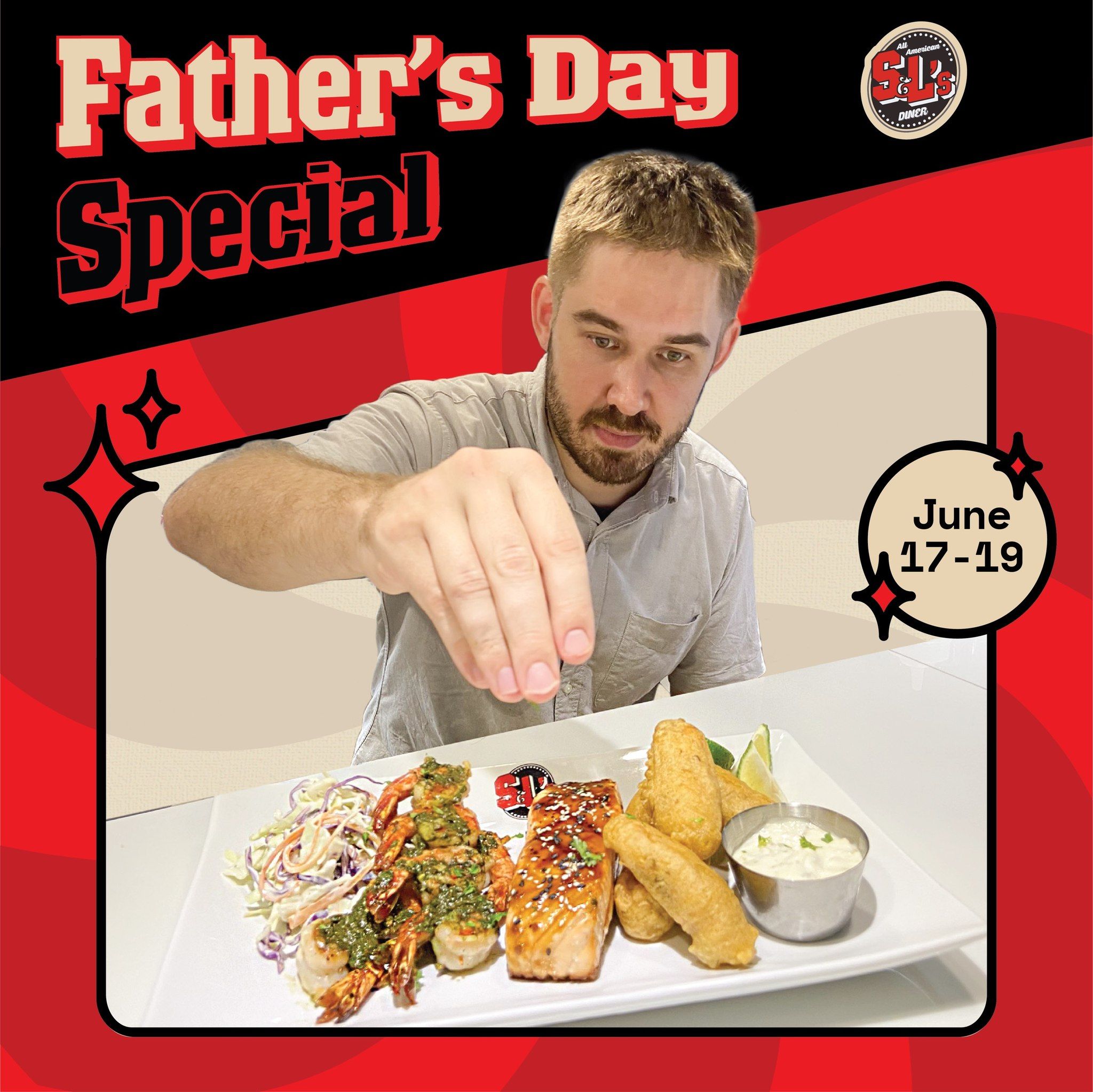 This Father’s Day weekend, S&L’s Diner is offering the SEAFOOD PLATTER for the first time in 2 years, featuring grilled Teriyaki Salmon, Beer- battered Tilapia, fresh grilled Pesto Shrimp skewers, served with a side of Coleslaw and home made Tartar sauce. Available June 17-19.